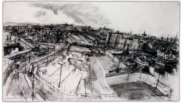 This large exploratory work was made on site from the top of the Salvesen tower on the edge of Aberdeen docks looking back towards the city. The drawing was used as research for a public art and redevelopment proposal for the harbour area of Aberdeen. The proposal was unsuccessful, but the drawing remains as a record of the city in 2003.