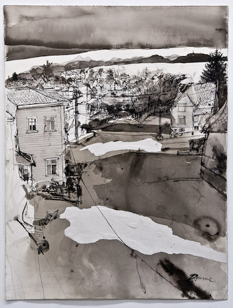 ‘Beyond the Karmsund’ was the view from my Norway studio, looking across from the island of Karmoy over the port town of Kopervik towards the glaciers and mountains of the mainland. I was fascinated by the long light produced by the low slant of the sun, as being so unusually north, sunlight was in short supply at that time of year. The island, situated on the northern side of the Stavanger Fjord, was one of the hosts for the North Sea Project, a visual arts exchange between Scottish and Norwegian Artists during Stavanger City of Culture 2008.