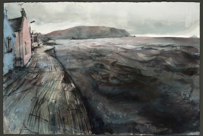 The subject for ‘Full Tide’ is the concrete seafront road of Gardenstown, at the moment of the highest tide. The work was made and internally constructed through a series of wave-dodging winter walks, on-site sketches and short films works. The proximity and contrast of the North Sea to the cottages of the village with only a narrow road between is really the point of the work. I want the viewer of this work to feel the depth and danger of the winter sea when looking at this work. I was experimenting with the different properties of ink + watercolour+ water to create a sense of depth beneath the water surface.ink, acrylic, watercolour and gouache and collage on arches