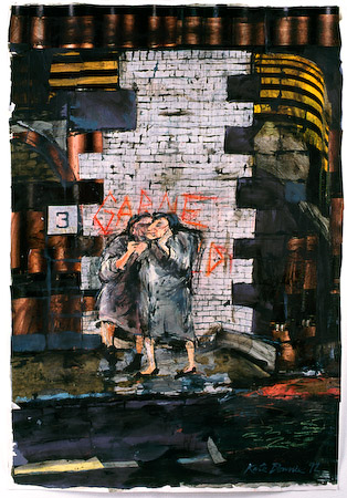 The Joke is one of a series based around my interest in a particular interchange in the heart of Edinburgh. This place, sited under a railway bridge by Holyrood, acts as a kind of boundary between the Royal Palace (& now parliament) and an ordinary working class tenement area of this city. 'The Joke' was made at a time when event or performance became a serious element in my work. As I was out on the edge of the pavement making this large collage, two cleaning women stopped to observe me on their return from an early morning shift. They gawked and laughed at the (to them) hilarity of my actions. We were 'characters' to each other, performers in the play of street life.