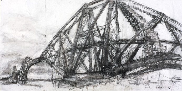 This large site drawing focused on the famously endless job of painting the Forth Rail Bridge. Drawn from the shore on the Fife shore, it became the inspiration for the millennial lithograph ‘Span’. It was first exhibited at the Talbot Rice Gallery in the exhibition ‘East’ in 2001. I made my first drawing of this Bridge for my first solo show in Edinburgh in 1985, ‘Coastlines’.