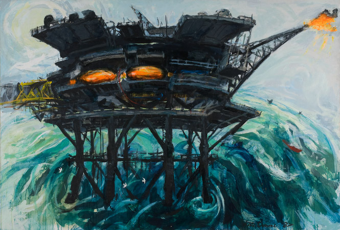 In 1987 the French oil company Total Oil Marine hosted two short artists residency posts from its Aberdeen-based headquarters for one of their production & drilling rigs (North Alwyn A) situated in the North Sea near the Arctic Circle. This painting was one of the works made following this residency. Owing to the political and emotional reaction to the Piper Alpha oil disaster shortly following this residency project, this painting was never exhibited beyond the WASPS studio Gallery. The residency lasted for one week only but produced three print editions based on the artists north sea oil platform drawings in collaboration with Grays School of Art in Aberdeen, Scotland.