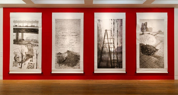Installation view 4 x ink painting scrolls on red wall400cm x 800cm Walk Through Resonant Landscape Royal Scottish Academy 2013