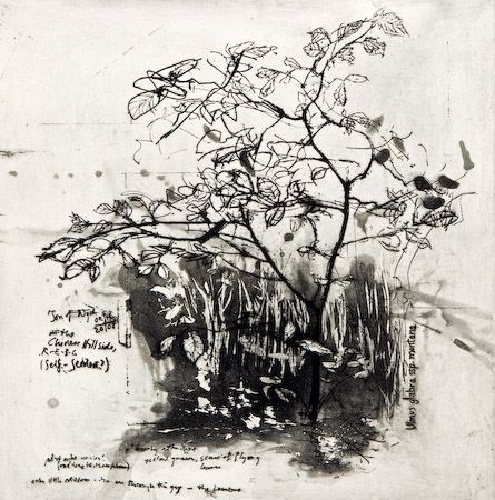This etching is based on a self-seeded offspring of the original elm, which was found growing quietly amongst the bamboo of the Chinese hillside garden in November. The seedling has since been destroyed. Available for sale - contact Kate Downie.