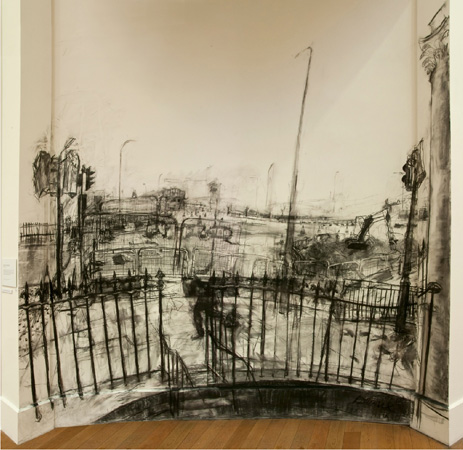 As one of the Invited artists in the 184th Royal Scottish Academy in 2010, the artist drew directly in charcoal onto the curved ‘alcove’ wall surface which joins two main gallery spaces, the work evolves over 25 hours, layer upon layer of different barriers, the routes through the city junction obscured, strange new spaces created. The drawing interrupts the calm progress of viewing pictures, echoing the disruptive tram works chaos outside on Edinburgh’s streets and junctions.