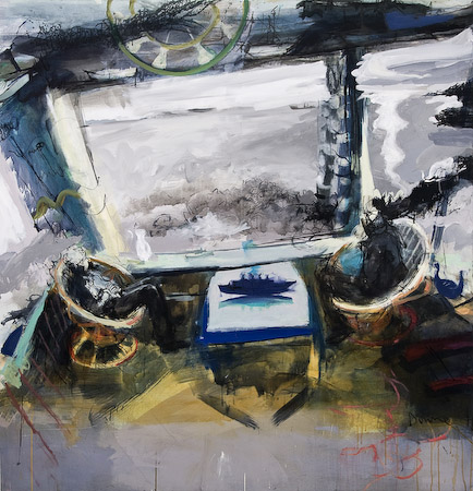I made the original drawing from inside a cottage on the edge of the Karmsund, in Karmoy, looking out to all the passing ships, remembering stories from the island people about their sea faring past. It became a link painting between two exhibitions, and was first seen as ‘The Sea Room’ in The Watermill show of the same title in May 2008.