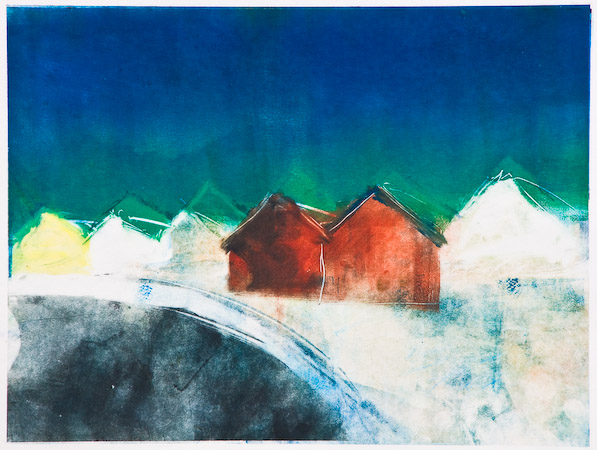 Based on a ā60āsā fishing village on the west coast of Norway on an ancient Viking site. Little box houses, wild winds, curved road- 3 elements. I made this work during a happy and productive week in a print workshop in Skudeneshavn, a guest of artist Anna-Kristine Ferking, as part of the Stavanger city of culture North Sea project.