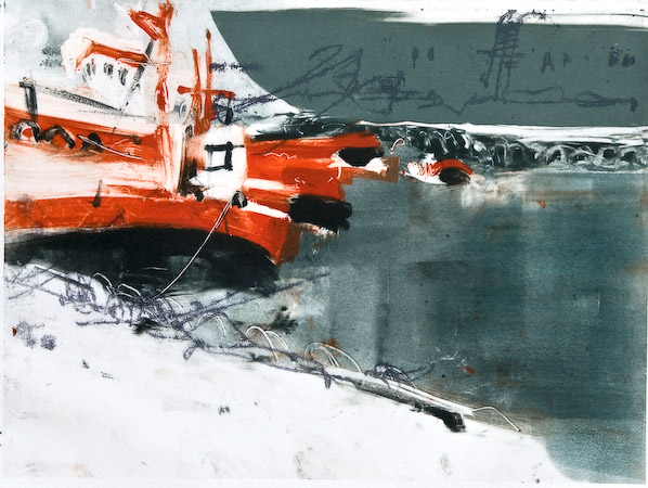 This vision became many monoprint versions explored at the Glasgow Print Studio in the winter of 2007-8 , and a small painting too.