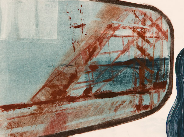 One of the Coast Road Diary monotype series, this image is one of a pair, the other titled ‘There’. On a train heading north, crossing the Firth of Forth, this view at dusk from a train window is a quintessential Scottish experience, scaffolding and all: a place affectionately known to millions.